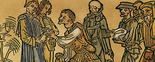 a) Ritter mit Banner / Knight Banneret • vom König geschlagen, mit Land, und eigener Dynastie • jedoch nur vom König zu vergeben • eigenes Schlagrecht (kann Ritter erheben) und ein eigenes Heer ausheben (Größe richtet sich nach Bannerrecht: ein Banner circa 25 bis 100 Mann) • Recht eigene Steuern auf dem Land zu erheben • ist allein dem König verpflichtet und unterliegt der Gerichtsbarkeit des Königs, wird jedoch einem lokalen Fürsten zugewiesen und diente im Frühmittelalter als Kontrollorgan für den König • Lehensverwaltung • wohlhabend • geringe Bildung (Lesen und Schreiben) b) Ritter ohne Banner / Knight Bachelor • von einem Adeligen mit Schlagrecht geschlagen, auch reguläre Fürsten, mit Land • kann aber kein Heer aus heben, da ihm das "Banner" fehlt • ist sehr gebunden an seinen direkten Lehnsherren • kein Recht auf eigene Steuern, sondern auf Abgaben (Zehnt) und verbriefte Rechte (Verhandlungsabgaben) • dennoch Fürsorge durch Lehnsherren, der ihm ggf. aushilft • Lehensverwaltung • schlechte Bildung c) Ritter (ohne Land) / Knight (without Land) • Ritter ohne Land, geschlagen von einem Knight Banneret oder Fürsten, meistens im direkten Gefolge, unmittelbare Gefolgschaft • Besoldung und Unterbringung durch Herren • Ausrüstung wird gestellt oder über Sold beschafft • meistens Hauptleute in Heeren oder Bannern • selten Bildung • keinerlei Verwaltung (kein Land) |