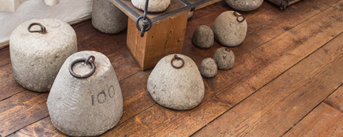 Lot - Das Lot war ein Kleingewicht, das regional verschieden meist zwischen 14 und 18 g wog und in der Regel als eine halbe Unze oder vier Quentchen definiert war. Gran - Von lat. granus (Korn), aus dem römischen Reich übernommene Gewichtseinheit, die ursprünglich dem Gewicht eines einzelnen Gerstenkorns (ca. 47 mg) entsprach. Pfund - Das Pfund ist die älteste und wichtigste Gewichtseinheit, konnte jedoch auf höchst unterschiedliche Weise definiert sein. Es wird vermutet, dass Karl der Große das Karlspfund als ältestes deutsches Gewichtsmaß einerseits von der römischen libra ableitete, andererseits von einem Bruchteil (1/64) des Gewichts eines römischen Kubikfußes Wasser. Vornehmlich diente das Pfund zur Festlegung des Silbergehalts der neuen Pfennige (novi denarii), von denen 240 auf ein neues Pfund kommen sollten, das damit dem Gewicht von 16 Unzen entsprach. Spätere regionale und lokale Pfundwerte entsprachen mitunter 12 oder 15 Unzen, ihr Gewicht schwankte zwischen rund 467 und 560 g. Zentner - Abgeleitet vom lateinischen centum („Hundert“), ein Gewichtsmaß von (meistens, aber nicht immer) einhundert Pfund. |